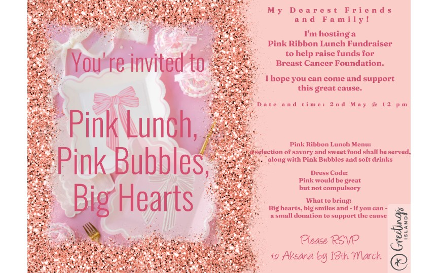 That’s why I’m hosting a PINK RIBBON LUNCH this year on 2nd May at 12 pm, to help change that.